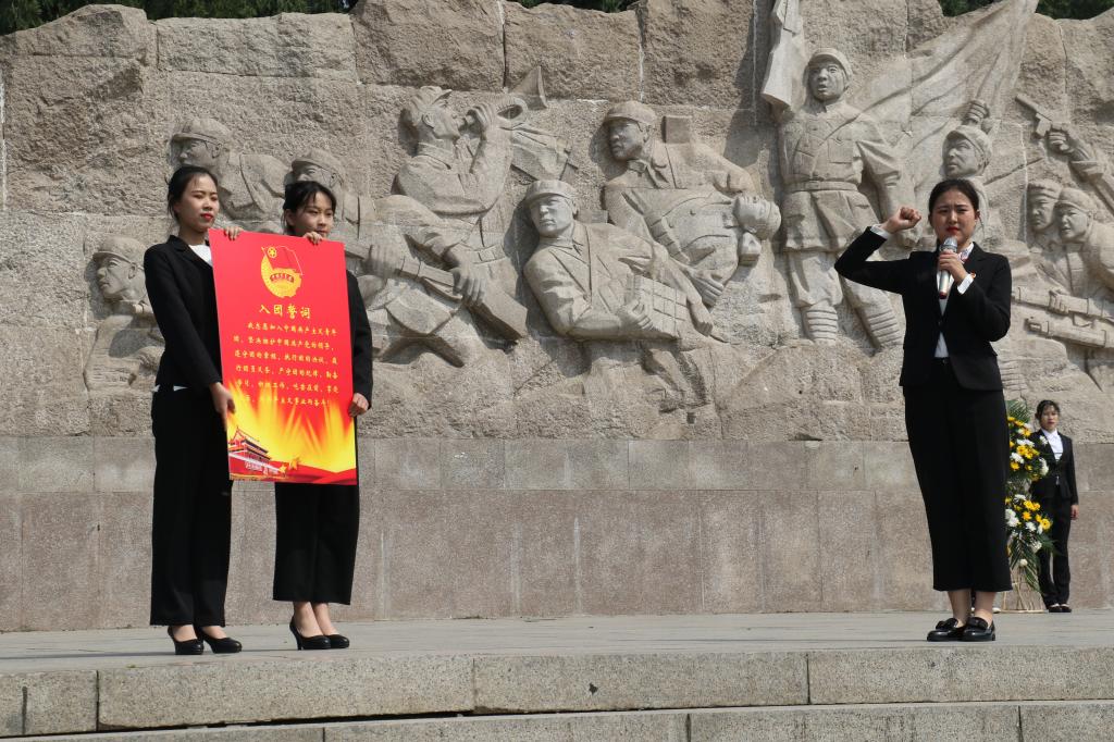 在英雄山革命烈士纪念碑广场,全体人员列队集合,齐唱国歌,大家敬献花束、向烈士三鞠躬并默哀三分钟。接着,学校马克思主义学院老师王明芳以纪念五四运动一百周年为主题,讲授“五四”精神微团课,她将历史的画卷在同学们面前展开,带大家深切感受到先辈们的使命与责任;青年团员代表李捷发表了题为“发扬五四精神、争做时代新人”的演讲,新老团员集体进行入团宣誓,重温入团誓词。随后,田莉春书记寄语现场团员青年,她希望广大青年朋友们进一步坚定理想、明德修身、勤奋学习、深入实践。她感慨青年朋友们生当其时,欣逢盛世,应当以只争朝夕的精神、水滴石穿的毅力、永不满足的态度,进一步学习,不断提升,勇做时代前进的参与者、开拓者、奉献者。最后,田莉春书记为新入团团员佩戴团徽,全体人员齐唱团歌。