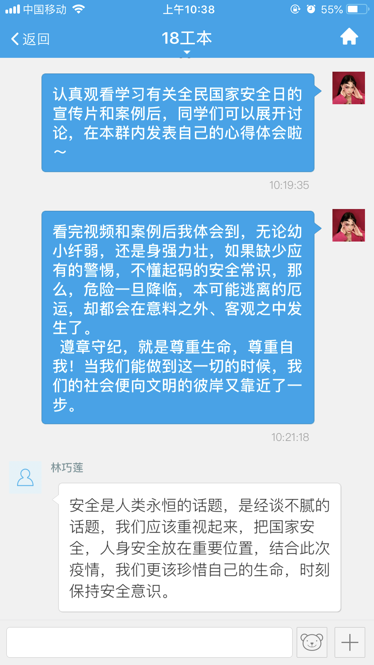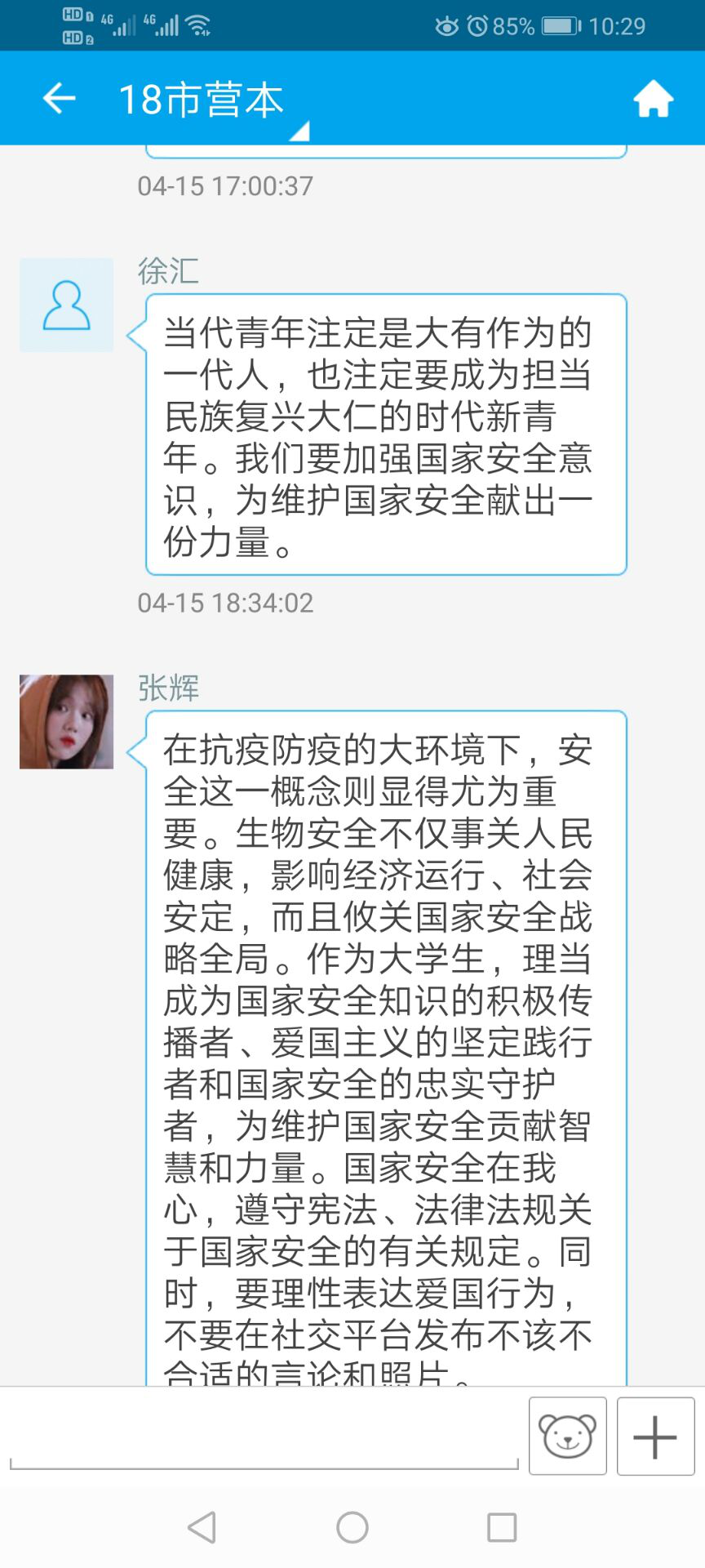 各班级通过到梦空间空间组织了“维护国家安全,责任你我他”线上主题班会活动,同学们也在易班班级讨论组内展开了激烈的探讨,并对国家安全的认识和看法发表了自己的看法。学而不思则罔,思而不学则殆。下面就让我们一起来看一下同学们的心得体会吧。