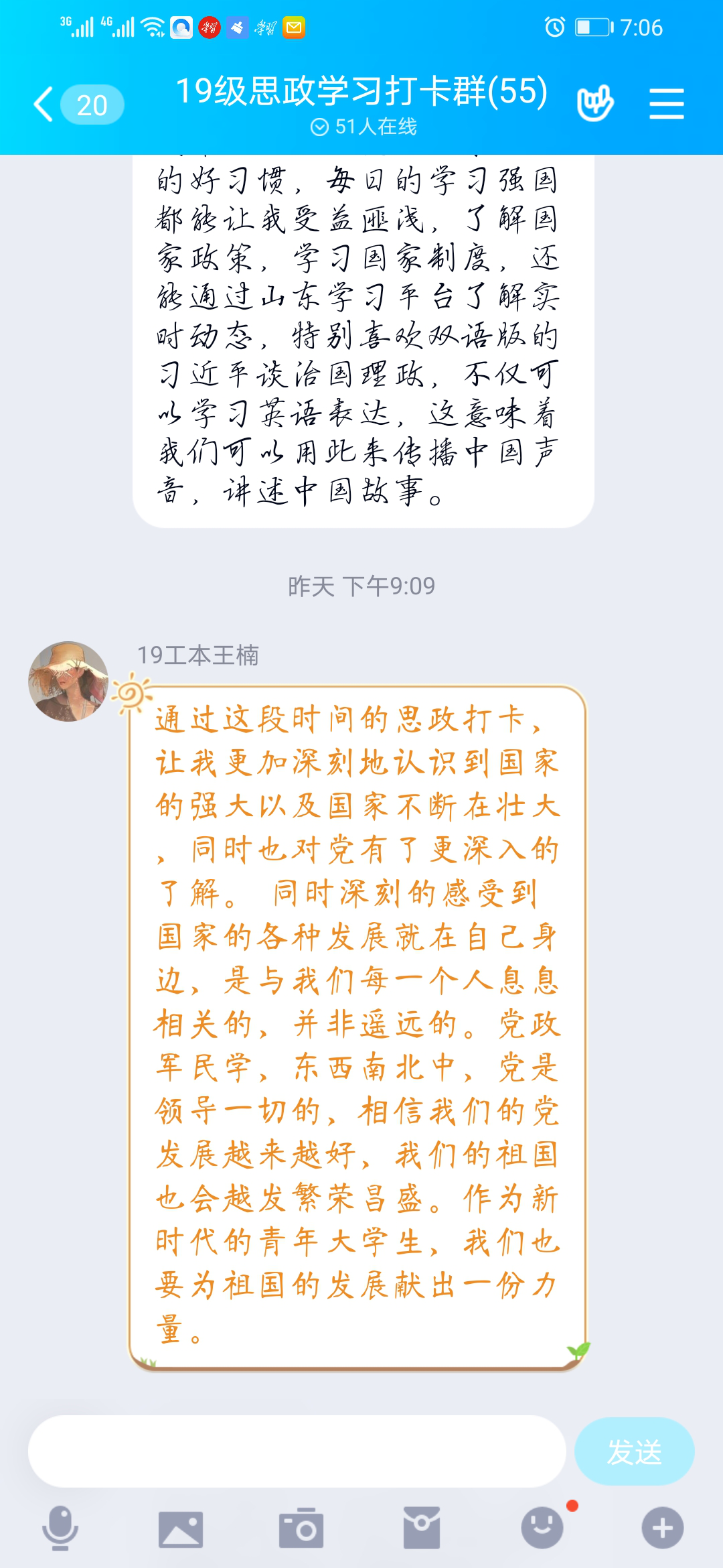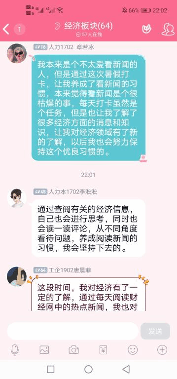 “云学习社区”分为“云思政”“云经济”“云英语”“云体育”“云文学”五个板块,每个版块配有专业教师指导,学生按照个人兴趣自愿选择板块报名。各个社区版块在教师指导下,依托“学习强国”“灯塔-党建在线”“微信读书”等平台阵地,自我教育、自我管理,有计划学习打卡,定期与不定期结合开展线上交流和答疑,打破了时间和空间的局限性,营造了积极、活跃的学习氛围,激发和带动版块中每个个体的主动学习意识,提升了学生的自主学习能力。