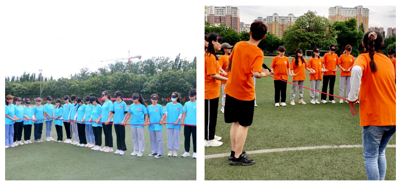 在失去视觉的前提下,盲人方阵游戏不仅考验团队的配合与应变能力,更能体现出队友们的相互信任和相互配合。看,当出现失误时,他们互相包容、相互指正,认真总结失误原因;听,当游戏成功时,他们互相鼓励,欢呼雀跃。在游戏中学会团结,在协作中提高能力。