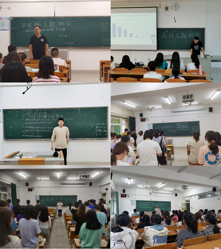 班会开始前,负责人将每种骗术要点写在黑板上,提倡全体同学起立共同念出。随后班级负责人针对五种骗术,用具体的例子分析并回答同学们的问题,加深巩固大家的反诈骗意识。会后,全体同学在反诈骗稿件背面签字,增强同学们的参与感并让同学们意识到此反诈骗活动的严峻性和重要性。