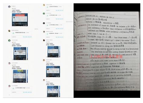 今年英语板块全新改版,在听、说练习中提升英语薄弱技能点,弥补单词打卡短板。线上使用“每日英语听力”软件,完成听力训练和口语训练,线下记录自己的学习内容并定期上传学习成果。学生打卡内容广泛,在精读的同时进行词汇量、口语、语法语义的训练。大家积极在“社区”群中分享自己的学习经历和学习经验,不仅养成了良好的英语学习习惯,提升了自己的语言技能,还在参与社群交流的过程中收获了同学们分享的英语学习干货。