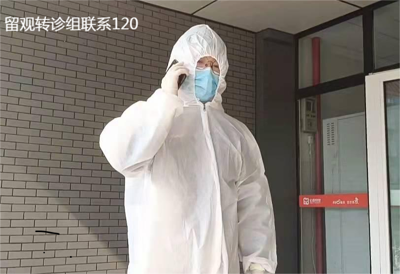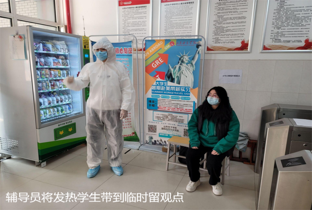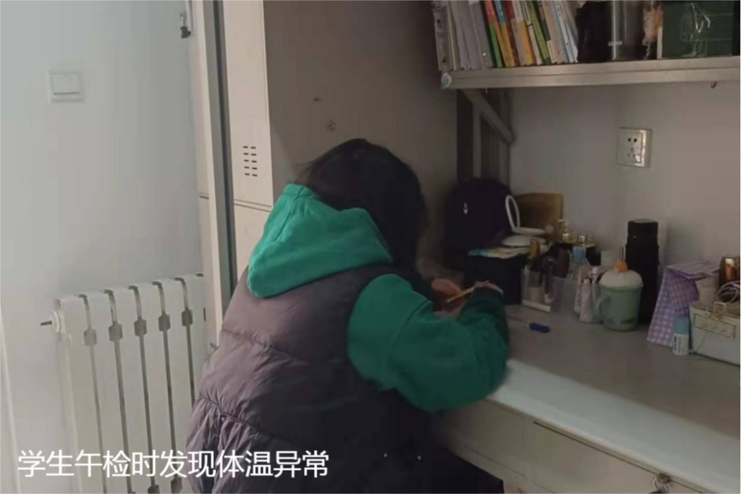 学生午检发现体温异常,立即向辅导员打电话报告,在接到学生电话后,辅导员上报院部联络员、院部疫情防控工作小组组长及8号公寓场地联络员,穿戴防护服第一时间到达现场陪同安抚学生,并将该学生带至8号公寓临时留观点。
