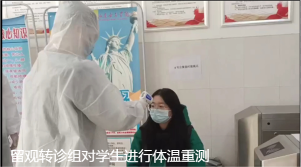 留观转诊组接到上报信息后立即赶到现场对发热学生进行复测,确认体温异常后,启动应急处置,报告学校应急处置负责人。