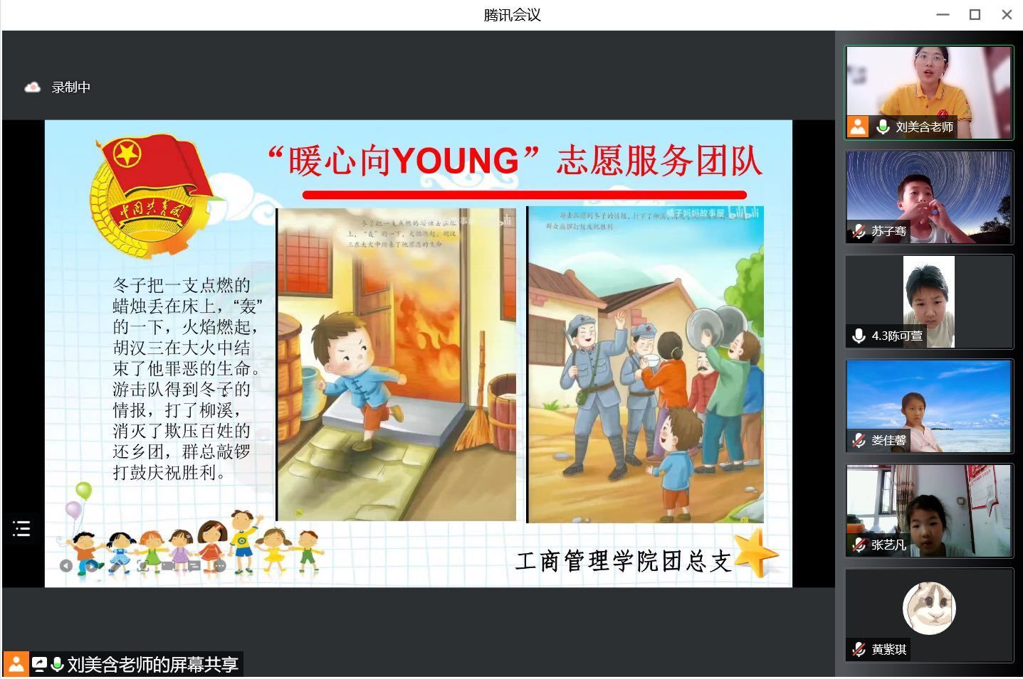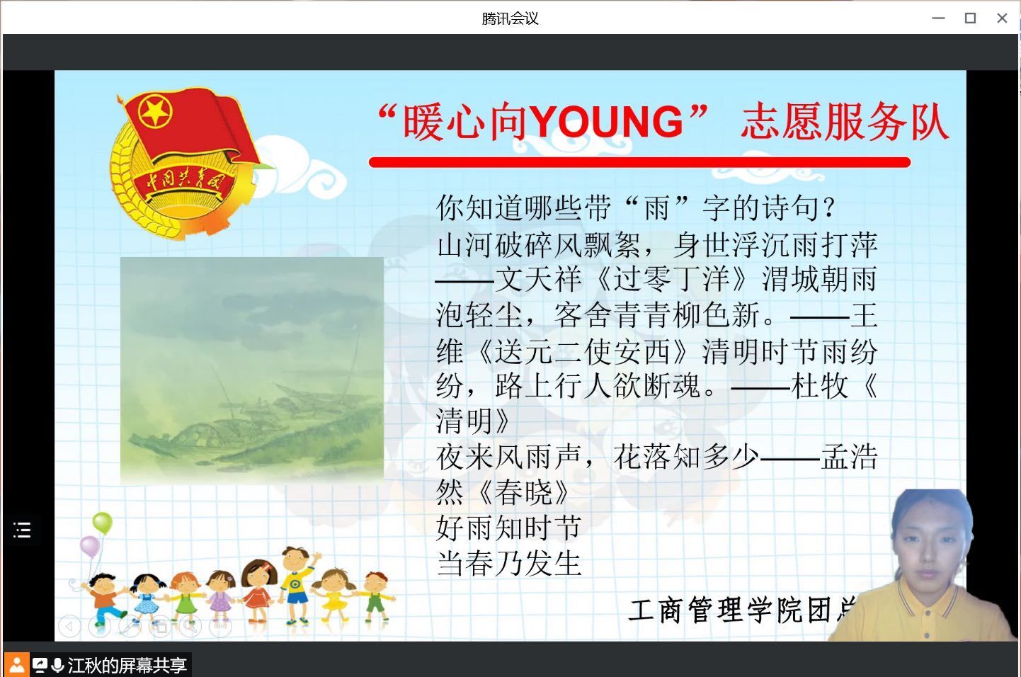 这次暑期线上“三下乡”活动,主要开展七节课程。如绘画、国学、团史党史等。每节课由志愿者通过腾讯会议进行主讲,在课上有丰富生动的PPT以及图文视频演示。另有几名志愿者负责在弹幕评论区调动课堂氛围、维持课堂秩序以及和同学们互动。