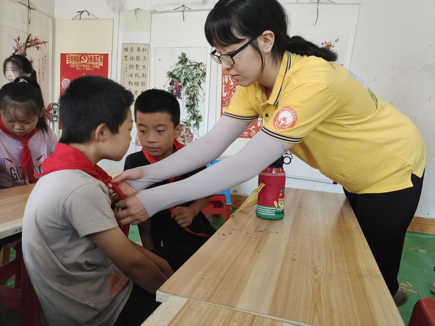 周一清晨,代表着新生的曙光的同学们,早早的来到学堂。在志愿者的带领下,同学们佩戴好庄严的红领巾,有纪律的站好队伍,向着国旗升旗的地方进发。