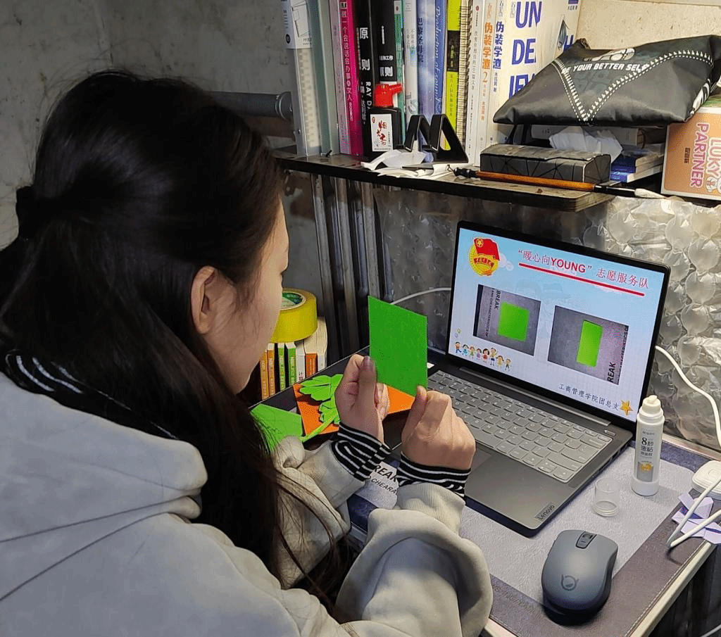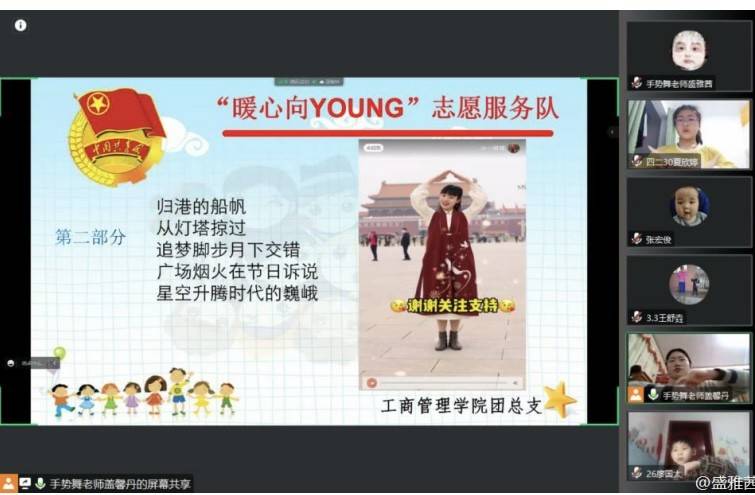 云端相伴共成长,携手奋进新征程。暖心向YOUNG志愿服务队携手济南市罗尔小学开展线上支教活动,本次支教共有两个模块:一是组织集阅读和运动于一体的日常打卡活动,志愿者与小学生结成“一对一”辅导小队,爱心相伴共成长;二是开展“社团小课堂”,以绘画社团、手势舞社团、中英绘本故事社团、手工社团为载体,我院67位志愿者用灵动教学培养同学们兴趣,用暖心课堂助力同学们成长。