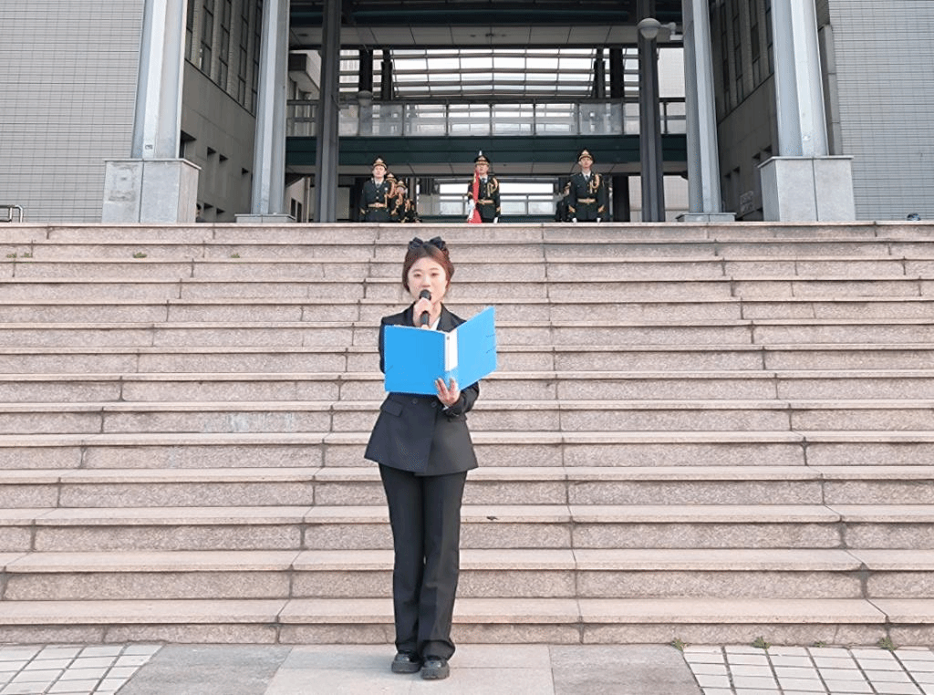 7:30分,主持人盛雅茜宣布升国旗仪式正式开始。庄严的国旗手气宇轩昂,踏着整齐坚定的步伐,伴着《护旗曲》,护卫着鲜艳的五星红旗缓缓入场。