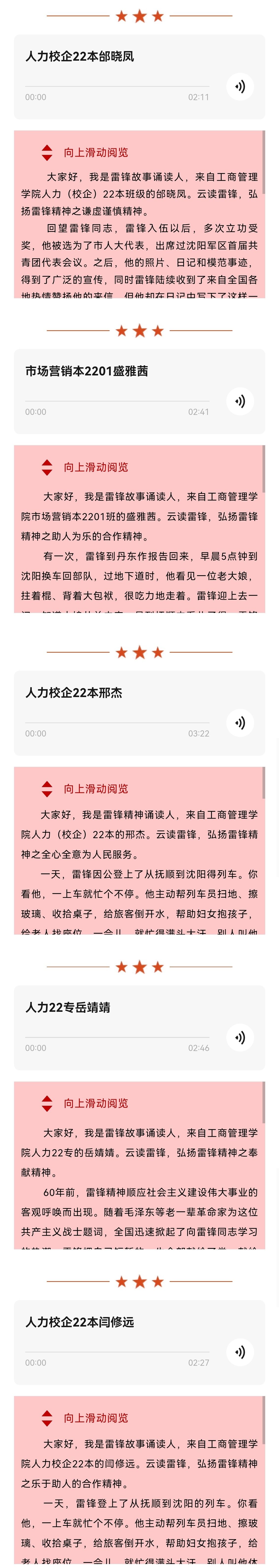 云读雷锋,让诵读者共鸣,让聆听者知悉。我院六十余人参与“‘锋’华正茂,‘艺’心奉献”云端诵读雷锋,讲述雷锋故事,与雷锋来一场跨时空的对话,让雷锋的声音被更多人听到。 “螺丝钉虽小,其作用是不可低估的。我愿做一颗永不生锈的螺丝钉。”……雷锋的每一句话,每一件事在同学们的声音中都显得如此有力,如此鲜活!