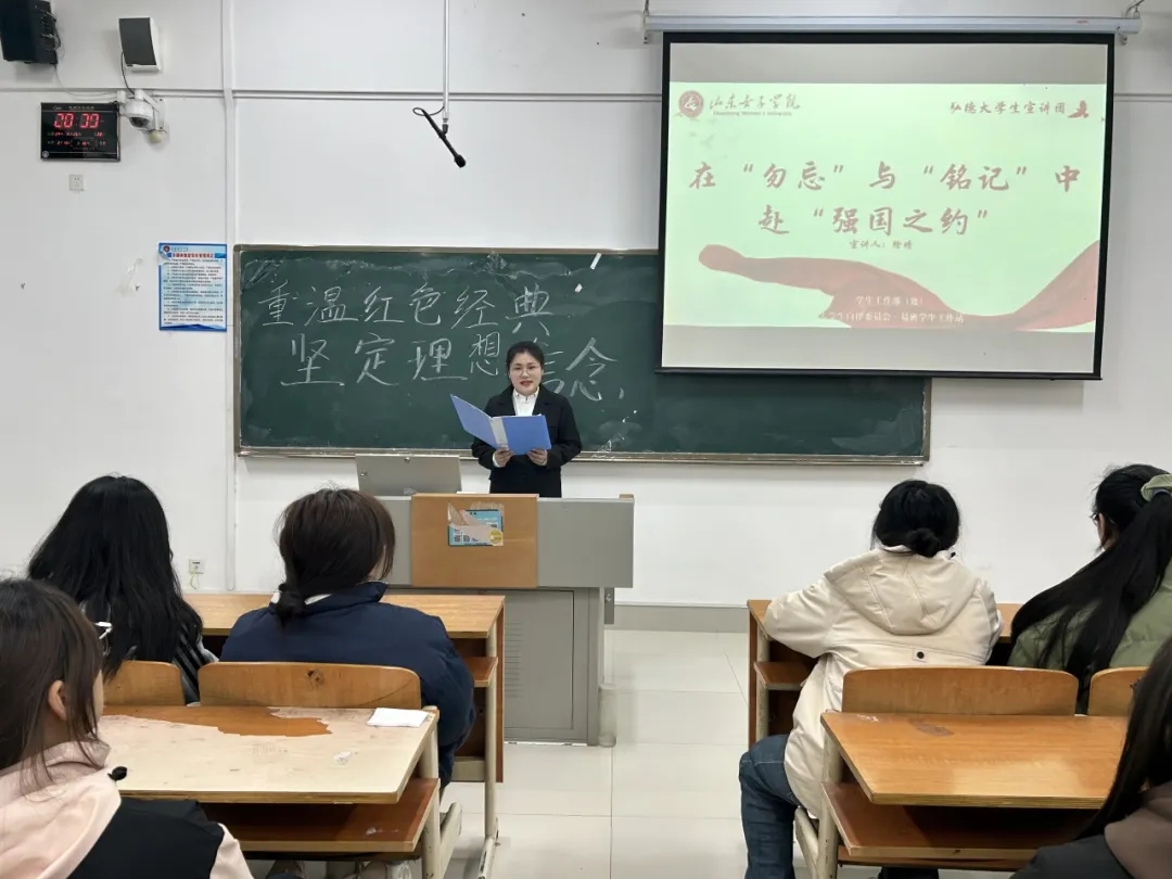 宣讲员徐晴以在“‘勿忘’与‘铭记’中赴‘强国之约’”为主题展开宣讲,从一部抗美援朝题材穿越短剧出发,再延伸到前两年四川凉山火灾事件,通过讲述革命先烈们的丰功伟绩,带领同学们共同回忆那些感人至深的红色记忆,阐明红色精神在如今社会中的重要意义和价值。徐晴同学声情并茂的演讲深深感染了在场的同学们,她号召大家继续发扬光大红色精神,把爱国之情转化为报国之志。