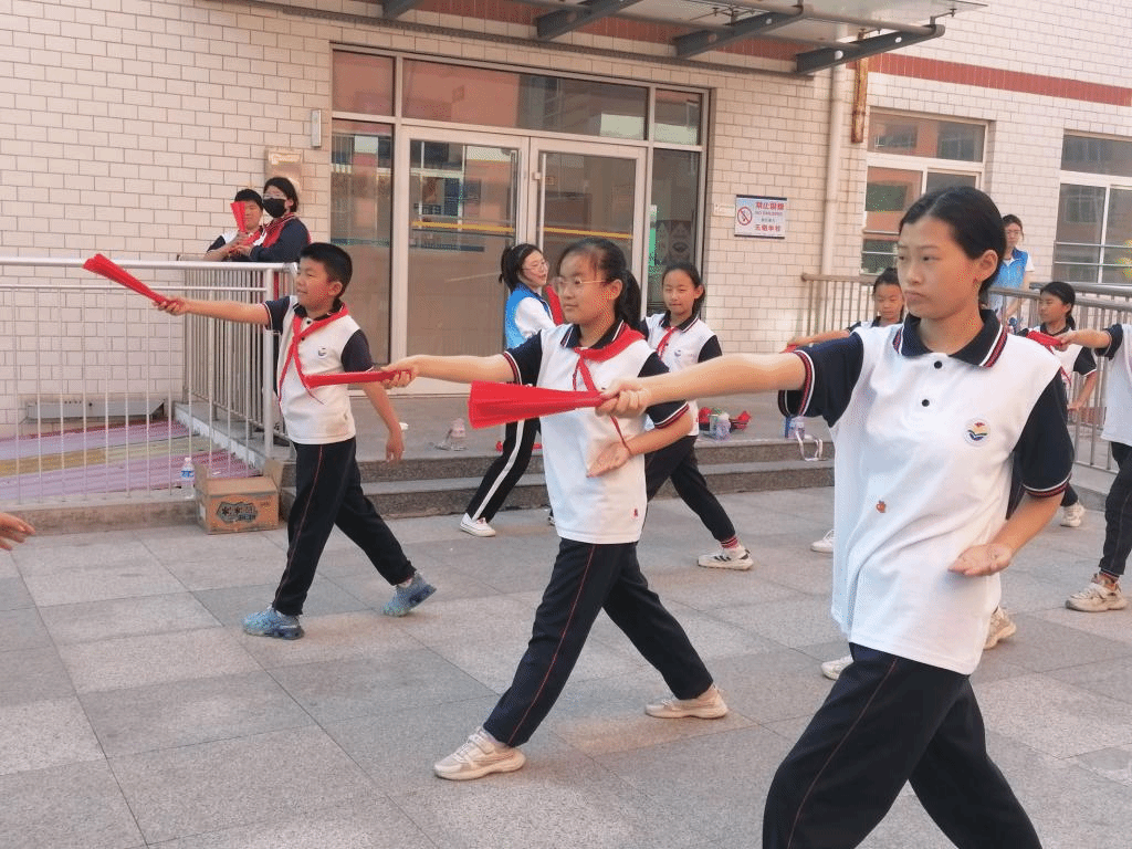 “起势、开步抱扇、侧弓步举扇……”,太极扇作为一种质朴端庄、舒展柔和的健身气功,由六节优美柔顺的动作组成。通过志愿者老师的讲解,同学们对其产生了浓厚的兴趣,他们一同伸展四肢,练习太极扇的一招一式,传承古人智慧的同时练就平和身心。