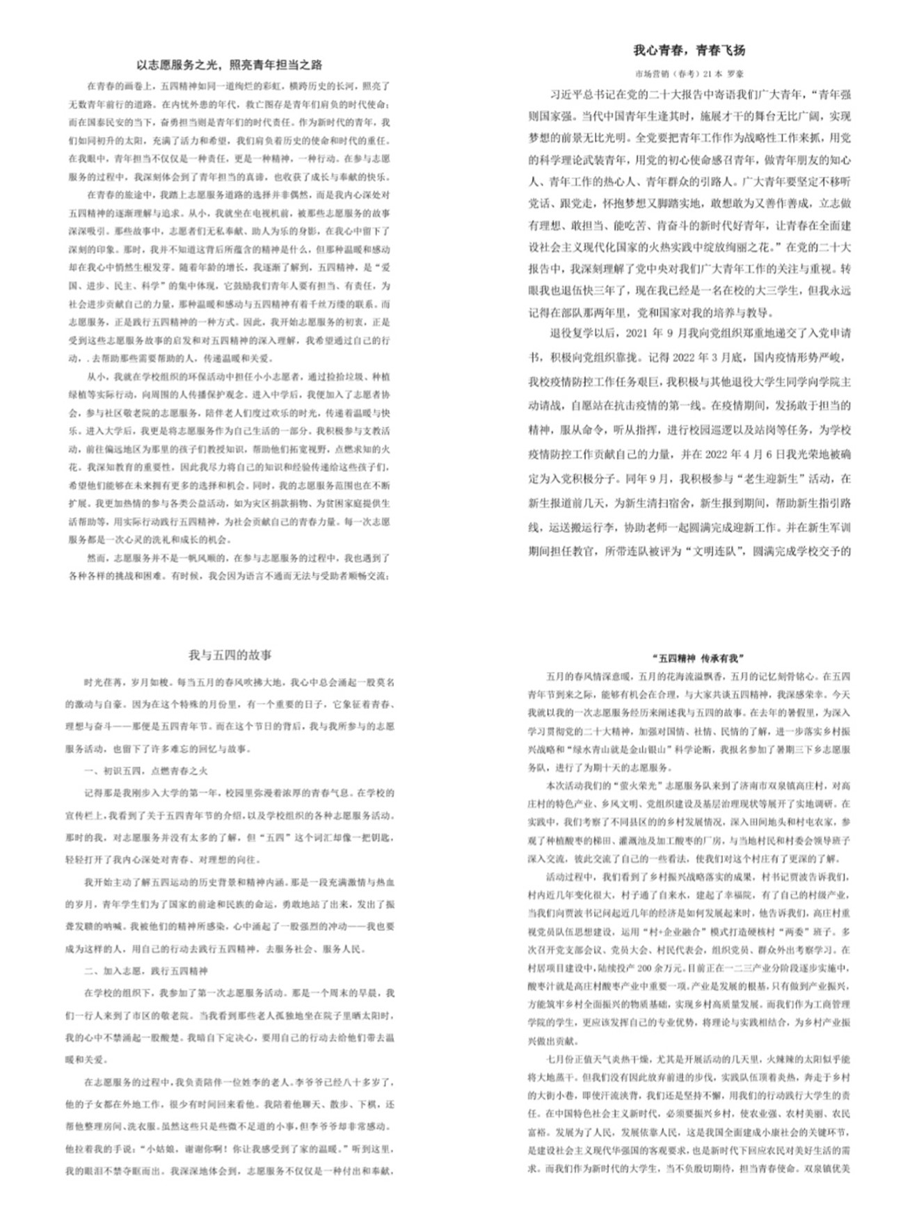 本次征文活动自启动以来,受到同学们的热情反响,收到稿件数篇。参赛作品主题鲜明、内容丰富,涵盖了记叙文、议论文、散文等多种文体。娓娓道来的入团入党故事令人动容,字里行间流露出的青年朝气生机勃勃。透过文字,我们似乎看到了他们担当责任的坚挺脊梁,看到了他们志愿服务时的坚毅身影。