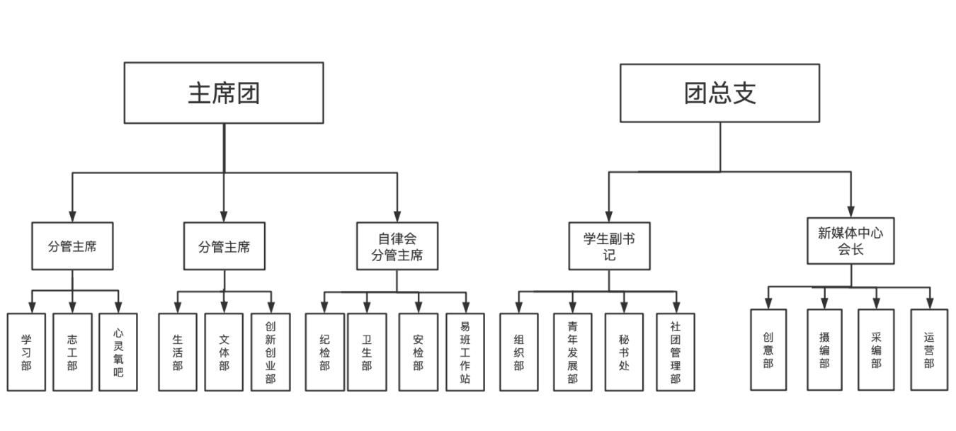 设学生组织主席1人,团总支副书记1人,新媒体中心会长1人,学生组织副主席3人。各部门各部设正部长1人,副部长根据各部具体情况而定,原则上不得多于30人。