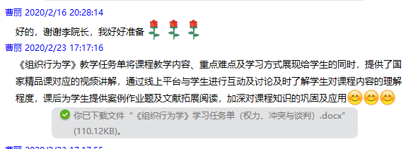 承担《组织行为学》课程的曹丽老师认为:《组织行为学》教学任务单将课程教学内容、重点难点及学习方式展现给学生的同时,提供了国家精品课对应的视频讲解,通过线上平台与学生进行互动及讨论及时了解学生对课程内容的理解程度,课后为学生提供案例作业题及文献拓展阅读,加深对课程知识的巩固及应用。