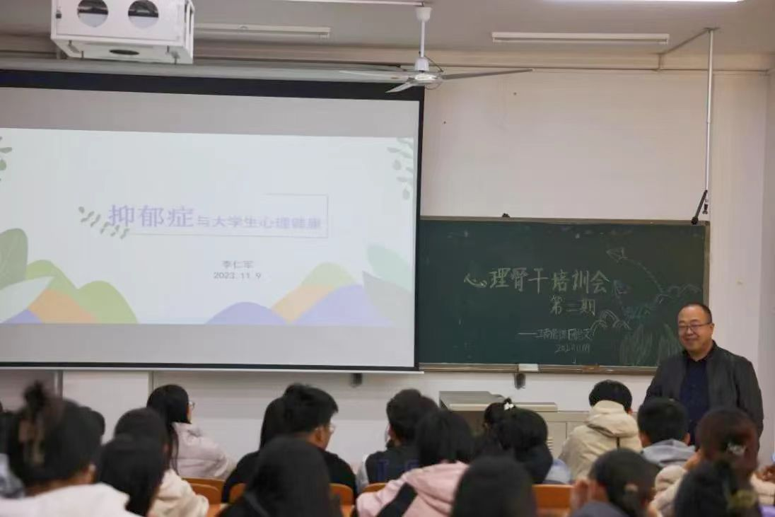 李仁军主任讲解了抑郁症的表现、病因分析以及日常如何应对,强调作为心理工作骨干人员要遵循的原则,包括保密原则、理解与支持原则、来访者自愿原则等,提供了一系列应对抑郁情绪的方法和策略。问答环节,李主任细致耐心地回答了同学们关于心理问题的提问。