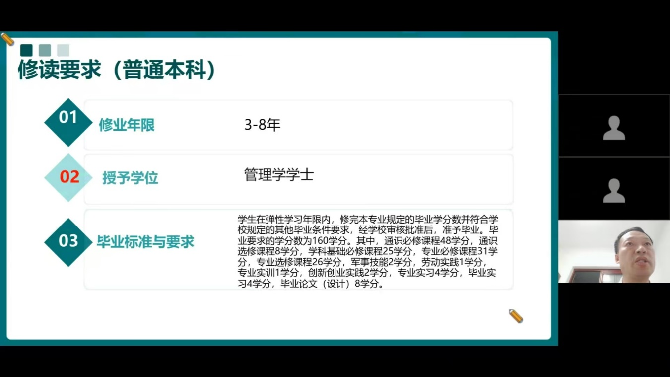 学院分管教学工作的秦善勇院长进行了教学规划的介绍,先后为专升本与普通本科的修读要求与课程设置概览进行了详细解说,展示了学院丰富的课程体系和教学资源。他强调,科学合理的教学规划是确保学生全面发展、提升综合素质的关键,学校力求为每一位学生提供合适的学习路径,助力学生书写出精彩的青春篇章。