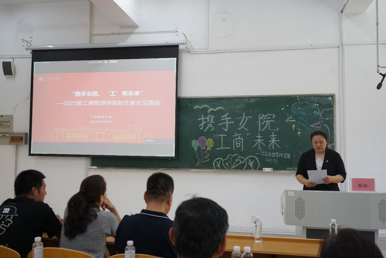 为搭建家校沟通桥梁,凝聚育人合力,帮助新生家长全面了解学院办学理念与育人体系,9月9日下午,工商管理学院通过线上、线下相结合的方式,成功举办“携手女院,‘工’商未来”2025级新生家长会。工商管理学院党委书记耿华、院长张可成、党委副书记杨晓斐、各专业教研室负责人,以及2025级新生辅导员齐聚一堂,与家长共同探讨学生成长成才之路。本次2025级新生家长会由耿华主持。