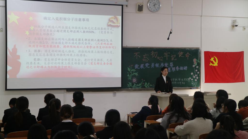 为继续深入推进“不忘初心、牢记使命”主题教育,激发大学生党员勇担时代使命的奋斗热情,发挥党员志愿服务精神和模范带头作用,带动周围同学积极向党组织靠拢。10月31日下午,工商管理学院学生党支部面向我院18级入党积极分子和19级班长、团支书开展“不忘初心、牢记使命”发展党员程序宣导志愿服务活动。