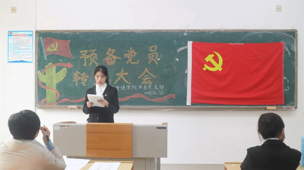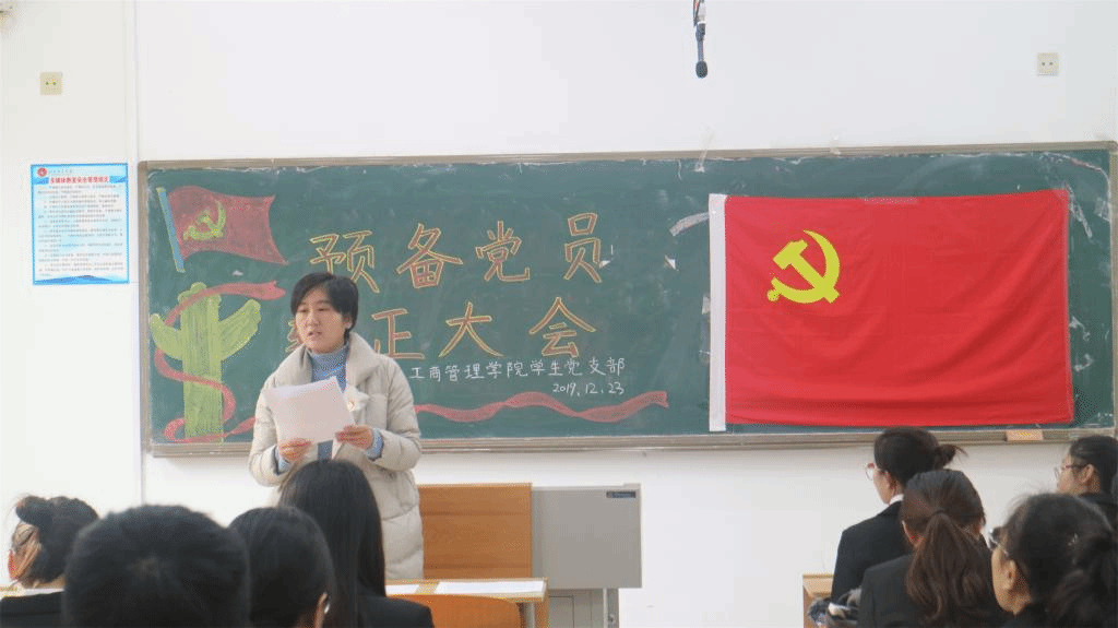 工商管理学院学生党支部于2019年12月23日在博学楼109教室举行了关于侯晨曦等18位同志预备党员转正的支部党员大会,会议由工商管理学院学生党支部书记孔圆圆同志主持,支部全体党员和部分入党积极分子参加了会议。