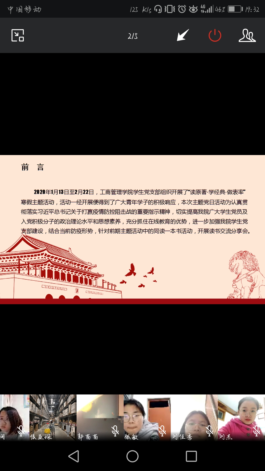 为学习贯彻习近平总书记关于打赢疫情防控阻击战的重要指示精神,切实提高我院学生党员及入党积极分子的政治理论水平和思想素养,结合前期同读一本书活动,工商管理学院学生党支部于3月27日利用企业微信平台开展 “坚定‘疫’心·同读经典·模范争先” 线上读书分享主题党日活动。全体党员和部分入党积极分子共130人参加本次活动。