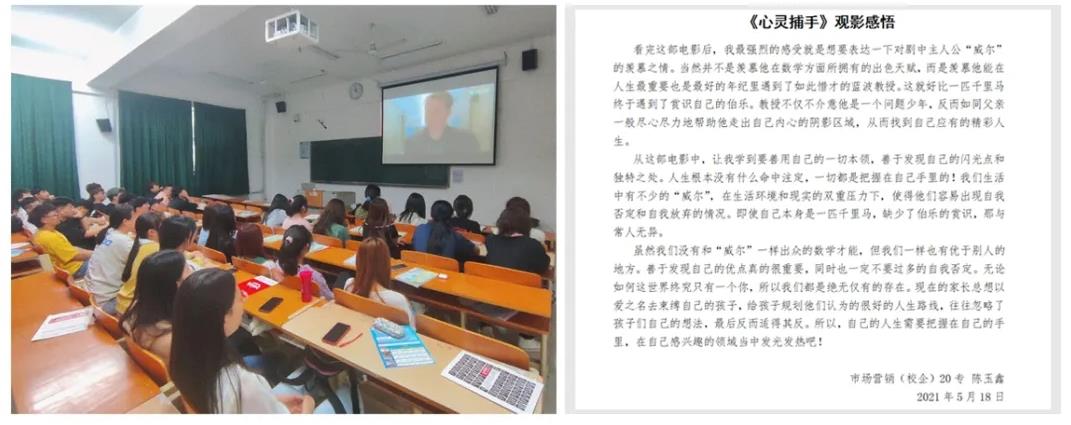 市场营销(校企)20级专科班于5月17日在博学楼106组织了心理观影活动,观看的影片为《心灵捕手》,同学们都对影片中的一句台词印象深刻:“我们都不是完美的,我们终将爱上的人也不是完美的,但我们不应害怕发现这些不完美就止步,而错过与我们而言最重要的东西。”