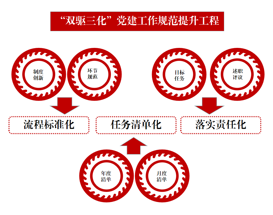 以签订年度目标任务书和年底述职评议考核为双驱,着力实现落实责任化。健全党建责任落实体系,细化责任链条,推行党委统领牵总抓、书记负责率先抓、班子成员齐心抓、党务干部全程抓、严督实导跟踪抓,年初与党支部书记签订年度目标任务书,将党支部规范性要求作为基础项重点考察,同时结合党委委员联系指导党支部制度督促抓落实,每年底组织开展党支部书记述职评议考核工作,形成责任落实闭环,做到人人有责任,人人抓落实,以责任倒逼规范提升。
