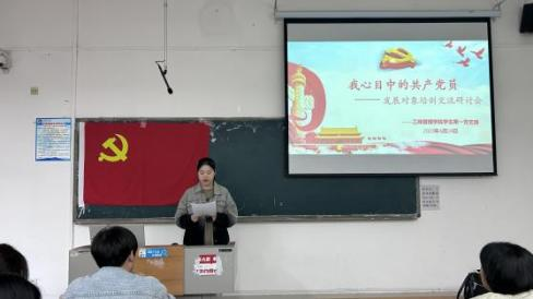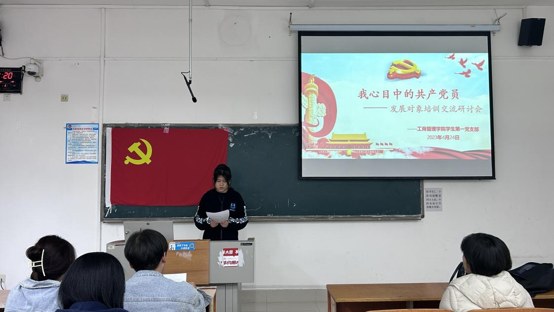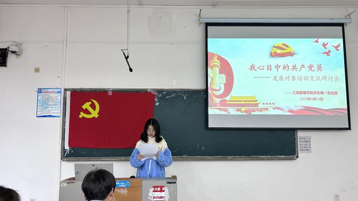2023年4月24日,工商管理学院学生第一党支部在博学楼107开展了以“我心目中的共产党员”为主题的发展对象培训学习交流研讨会。支部书记孔圆圆、部分学生党员以及发展对象参加会议,会议由杨洪金同志主持。