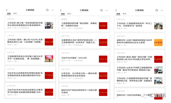 “e路同行”党建工作坊。建设运营“工管领航”微信公众号、开展“习语铸魂”主题活动、加强学生网络素养教育、引导学生党员积极参与学院舆情处置工作流程,充分发挥党员先锋模范作用,增强了思想政治工作的时代感和吸引力。