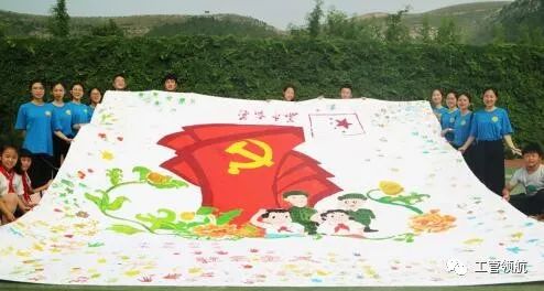 3.一枚党徽把身份亮起来。学生党员、团员与少先队员一起开展“你我画党徽”活动,以绘画的形式了解党徽背后的故事。在党员的耐心讲解和制作指导下,孩子们用稚嫩而灵巧的小手共同描绘了一枚巨型党徽。当“巨型党徽”完成并展现在大家面前时,少先队员唐铭悦激动的说:“没有共产党就没有新中国!我要用自己的双手,画枚党徽送给伟大的党!”紧接着他激动地把两个小手印深深地印在了巨型党徽的周围,表明了她跟党走的坚定信念和争做社会主义建设者和接班人的坚定信心。其他少先队员纷纷将自己的小手印印在党徽的周围。鲜艳的党徽和一个个小手印印在纸上,同时也印在了每一位学生党员、团员、少先队员的心中,进一步增强了学生党员亮身份、亮形象、亮承诺、亮担当的主动性。