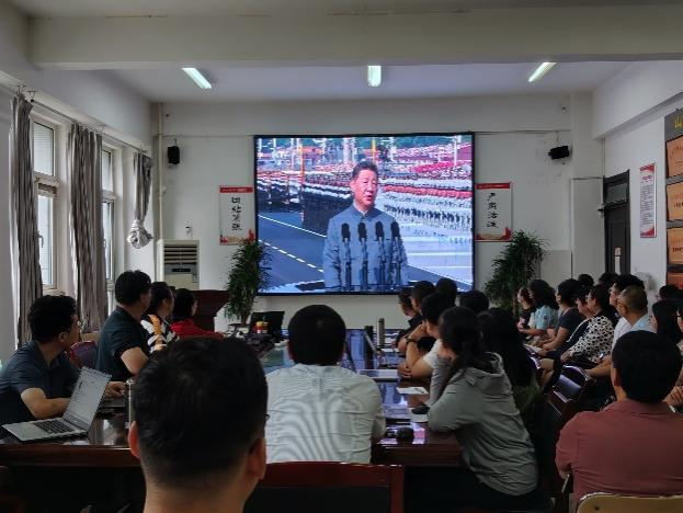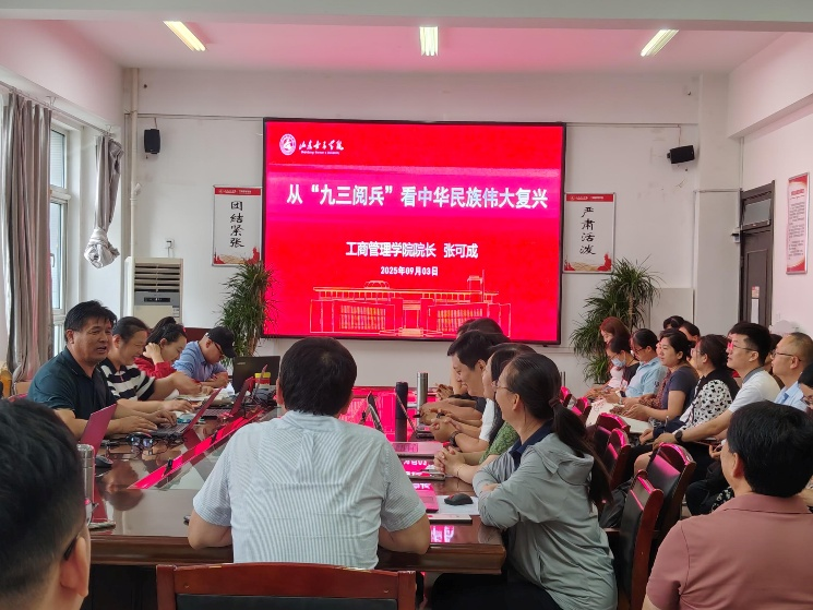 2025 年 9 月 3日上午,纪念中国人民抗日战争暨世界反法西斯战争胜利80周年大会在北京天安门广场隆重举行,工商管理学院组织全体教职工于博雅楼A401会议室同步观看直播,共同见证这一彰显国威、振奋人心的庄严时刻。