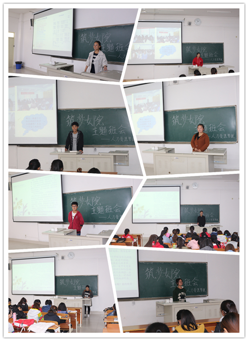 2017年10月24日上午,人力资源管理专业在博文楼302教室开展了有关于“筑梦女院”的主题班会活动。这次主题班会由团支书主持,班主任和全体同学参加。主题班会主要围绕了解女院概况、学习文明礼仪、树立职业规范与理想以及抒发观看十九大开幕式感想等内容展开。