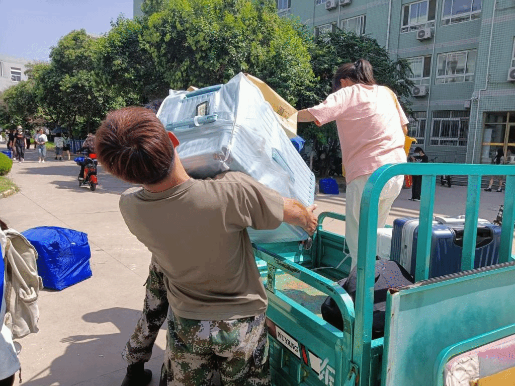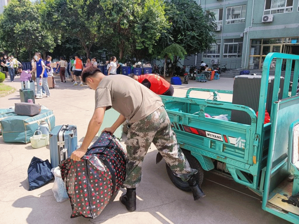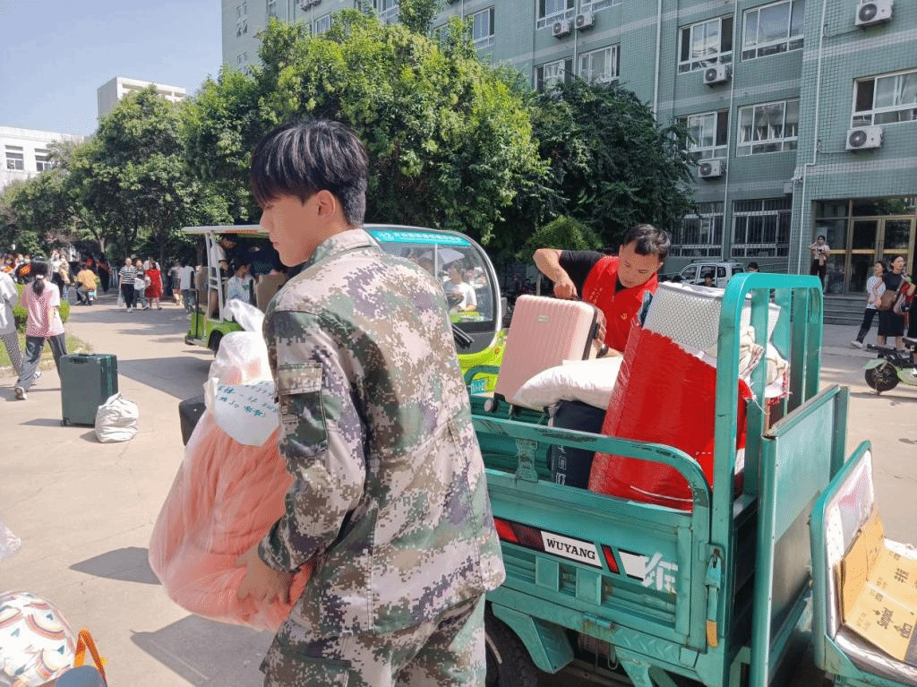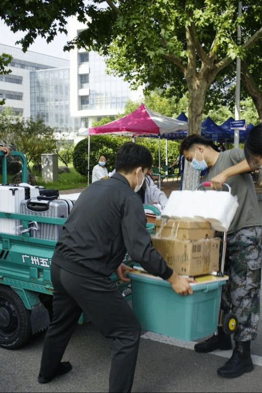 行李运输组负责提前联系准备运输工具,在新生报到处至新生宿舍进行“点对点”行李运输,以此来保证这次迎新活动的质量。在校园的道路上,退伍大学生们用肩抗、手举、背托的方式帮助新生搬运行李,并为他们指引路线,展现出了退伍大学生们乐于助人的优秀品质。