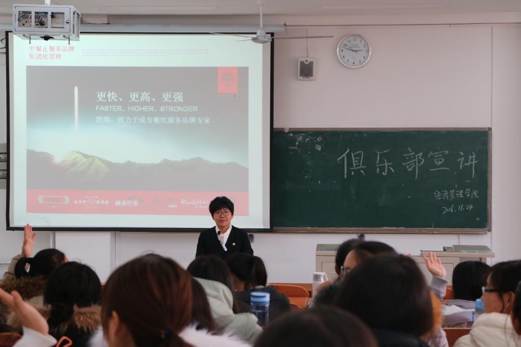 为了加强学生对企业的认识和感知,增加学生与企业之间的交流和互动,经济管理学院邀请了校企合作单位婴贝儿、如家和凯瑞三家企业于11月24日下午在博文楼210、308、310三个教室开展了俱乐部宣讲活动。三家企业的宣讲人分别是婴贝儿集团董事长刘长燕、如家酒店集团人力资源部经理于欢欢、凯瑞餐饮集团人力资源部经理熊云霞。经济管理学院2014级各本科专业、2015级各本、专科专业全体在校生参加了此次活动。