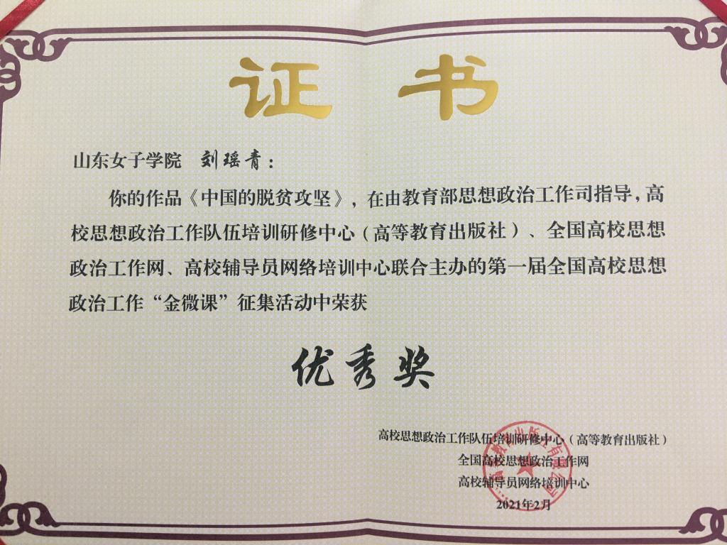 我院党总支副书记刘瑶青在由教育部思想政治工作司指导,高校思想政治工作队伍培训研修中心(高等教育出版社)、全国高校思想政治工作网、高校辅导员网络培训中心联合主办的第一届全国高校思想政治工作“金微课”征集活动中荣获优秀奖。