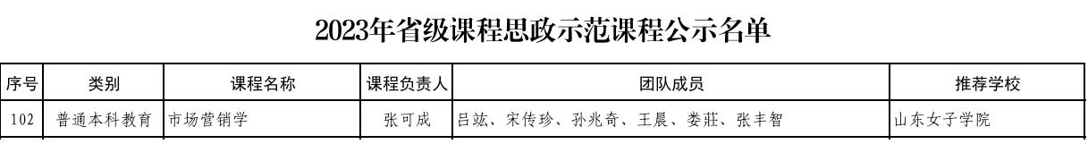 近日,山东省教育厅公布2023年省级课程思政示范课程名单,由我院张可成教授担任课程负责人,吕竑、宋传珍、孙兆奇、王晨、娄莊、张丰智参与的《市场营销学》课程荣获省级思政示范课程。该课程思政示范课的获批标志着我院在课程思政建设方面迈出了坚实的步伐,为培养具有社会责任感、创新精神和实践能力的高素质人才奠定了坚实的基础。